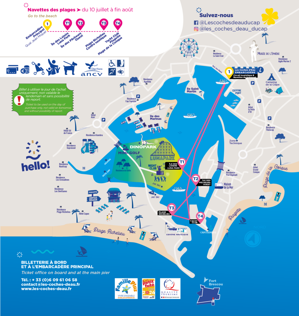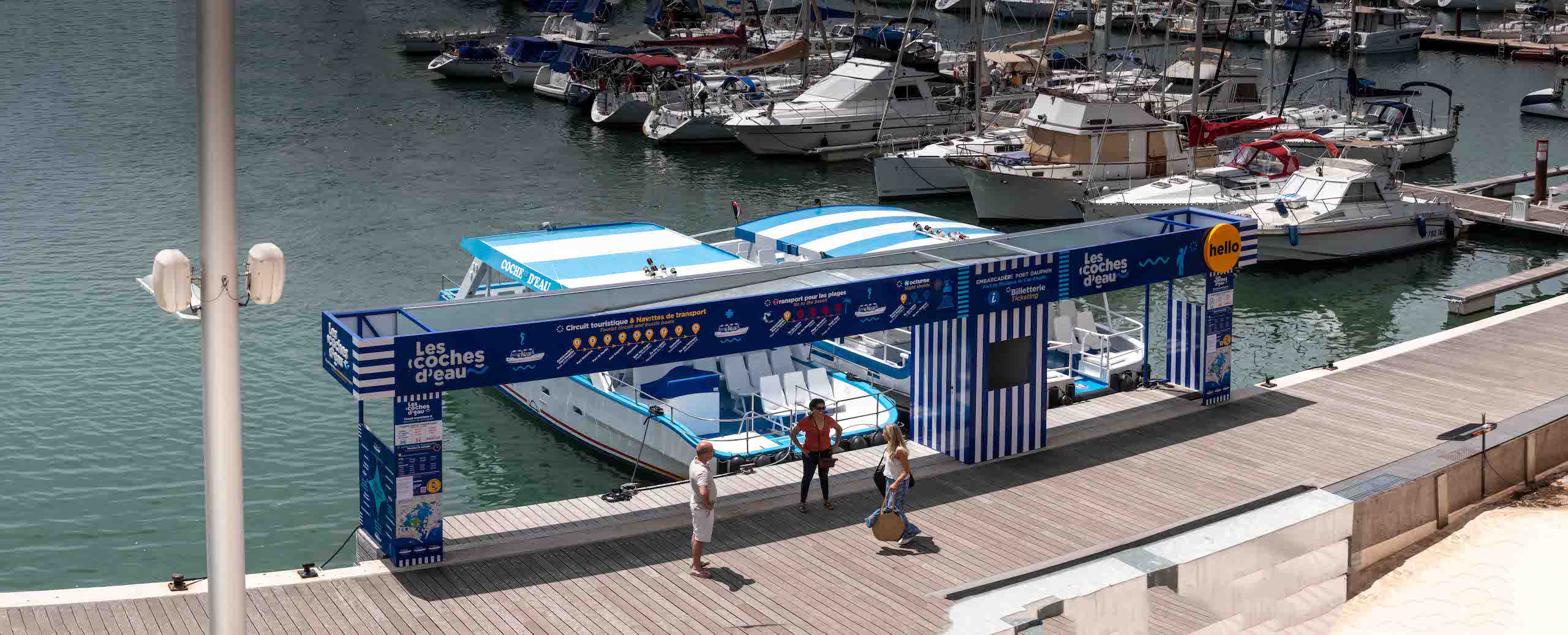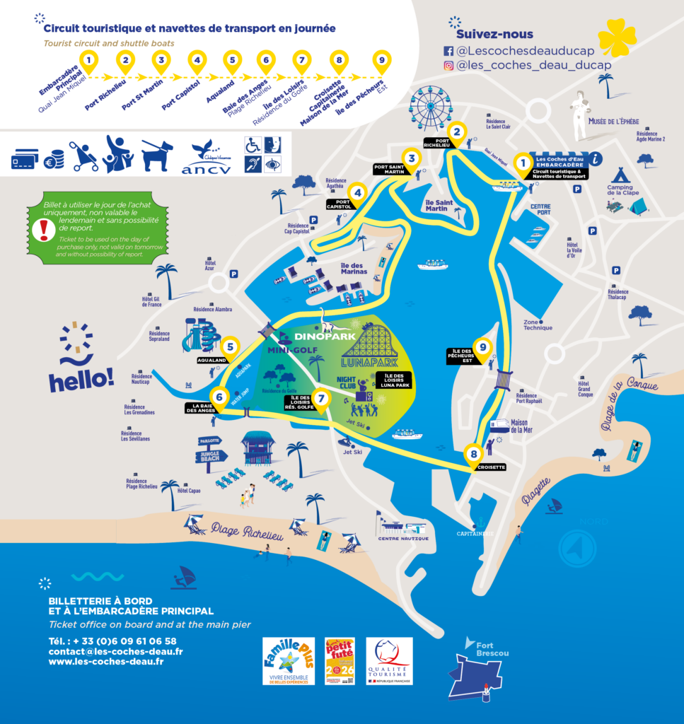 Hello ! Les Coches d’Eau. Depuis l’une des stations du Port de Plaisance desservies depuis l’Embarcadère Principal, embarquez à bord des bateaux-navettes des Coches d’Eau pour faciliter votre trajet.