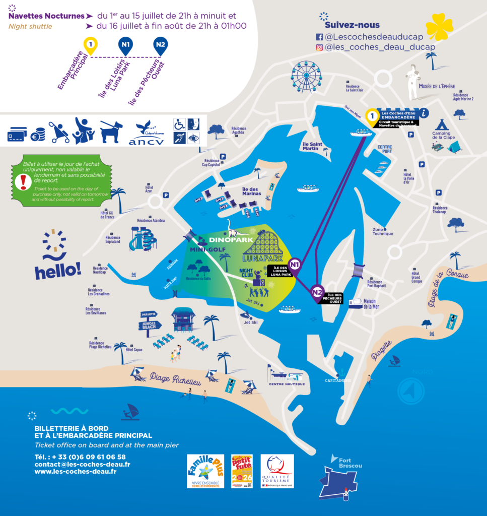 • Du 10 juillet au 30 août : de 10h à 12h et de 14h à 19h, au départ de l’Embarcadère Principal à destination de l’Île des Loisirs Lunapark, l’Île des Pêcheurs, la Plage Richelieu et le Yacht club, un bateau-navette toutes les 30 minutes.